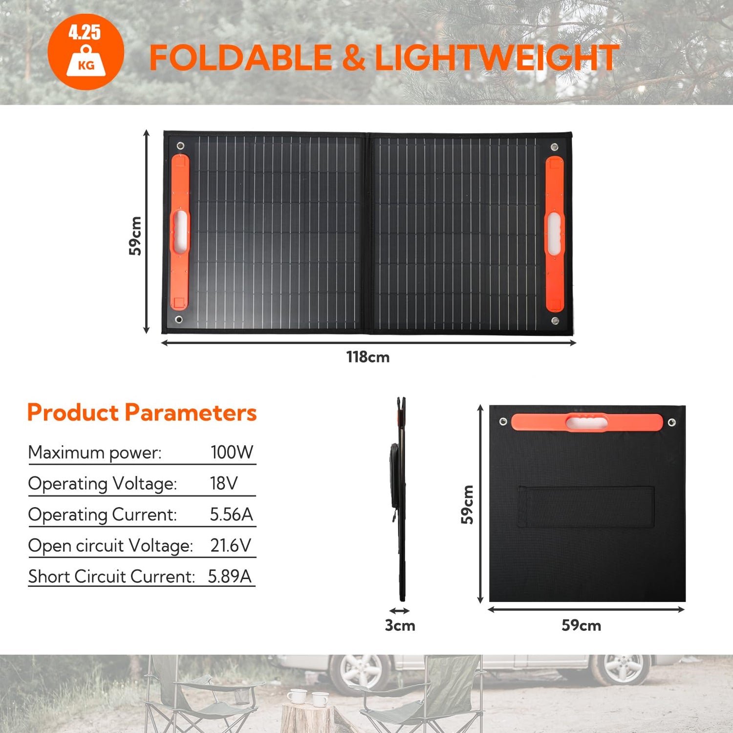Durable and Easy to Use -Exterior is made of durable and waterproof 1200D Oxford cloth.The panels themselves are covered with PET which not only helps with conversion but also prevents scratches.Position the solar panels using the adjustable bracket to get the most effective sunlight Foldable and Portable - When unfolded, it measures 118 x 59cm and folds down to a convenient size of 59 x 59 x 3cm for easy carrying