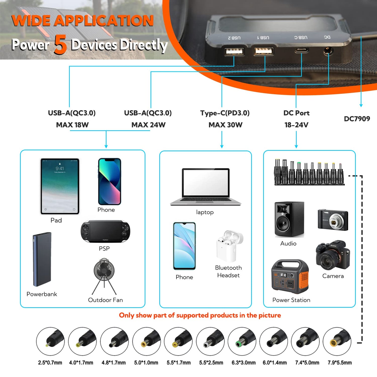 Anderson connector for Jackery Explorer 1000 and Goal Zero Power Station, 5.5x2.1mm DC jack for ROCKPALS power stations. Portable Power Station by Flashfish and GOLABS The solar panel also features USB and Type-C ports so you can charge your phone, tablet and similar devices directly. 2 USB Quick Charge 3.0 ports and a USB-C output (5V/9V/12V/15V/20V, 3.6A max)