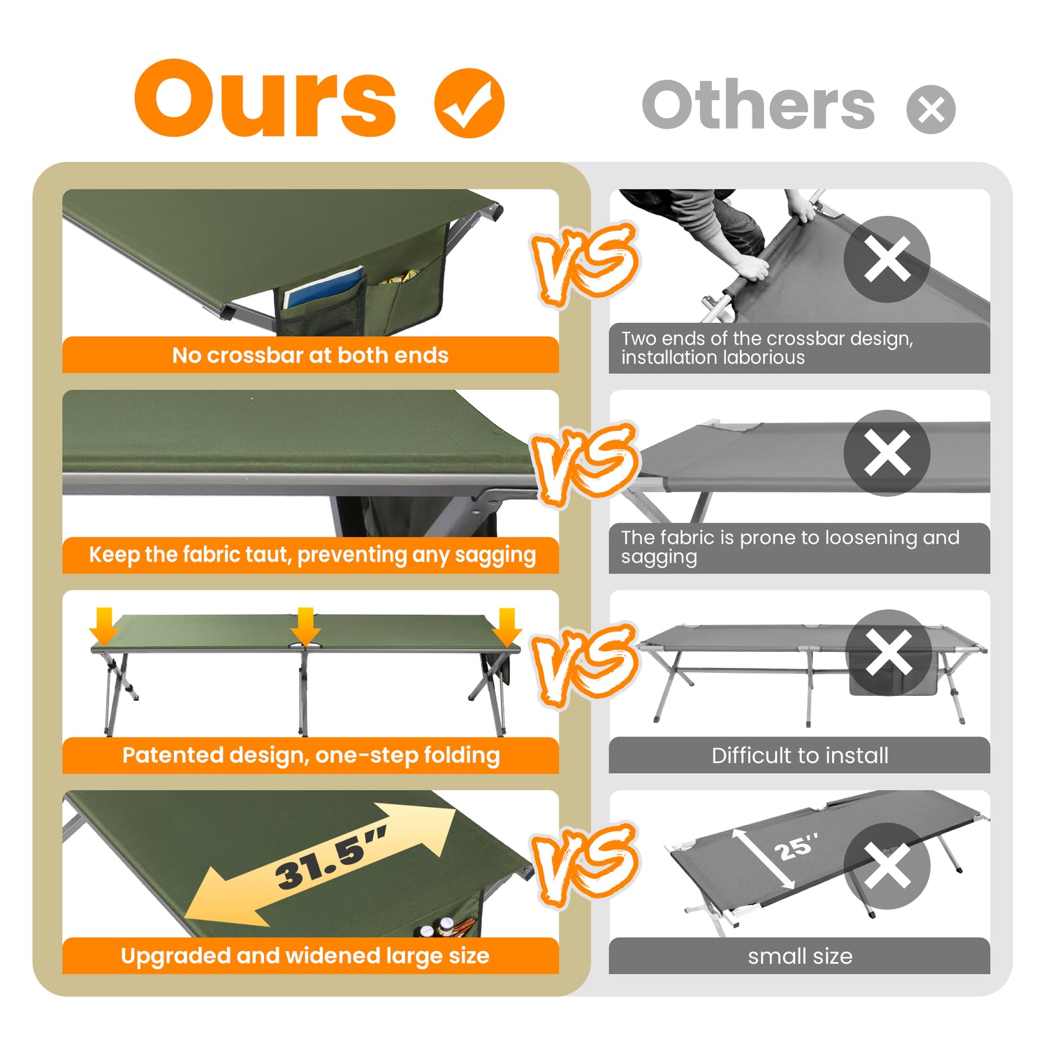 - Oversized size: with 210 cm length (suitable for people up to 210 cm), 80 cm width and 60 cm height, this camping bed offers spacious comfort without space restrictions.