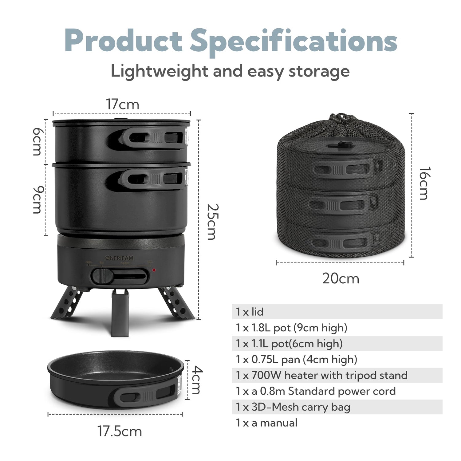 [Small size but large capacity] Despite its versatile uses, our electric pan takes up very little space when folded up - Ø18cm*15cm to be exact. With the included elegant black 3D mesh bag, you can easily take it anywhere, even stow it in your suitcase. Perfect for outdoor cooking adventures, small family gatherings or for use in dorms, hotels, studio apartments, RVs, campsites and gardens.