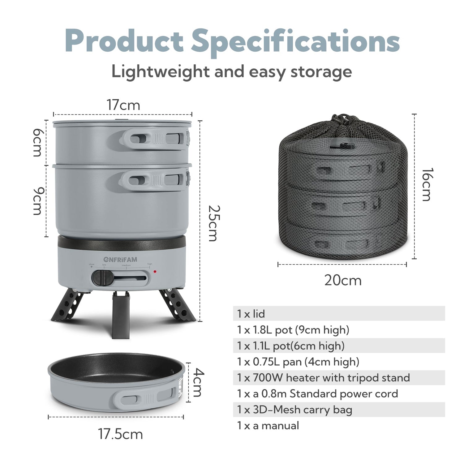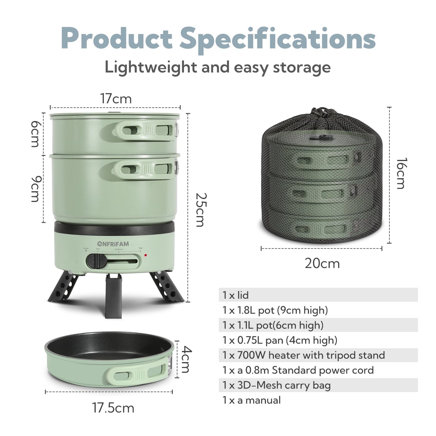 1x soup pot: Max 1.8 liters, Ø 17.5cm*9cm