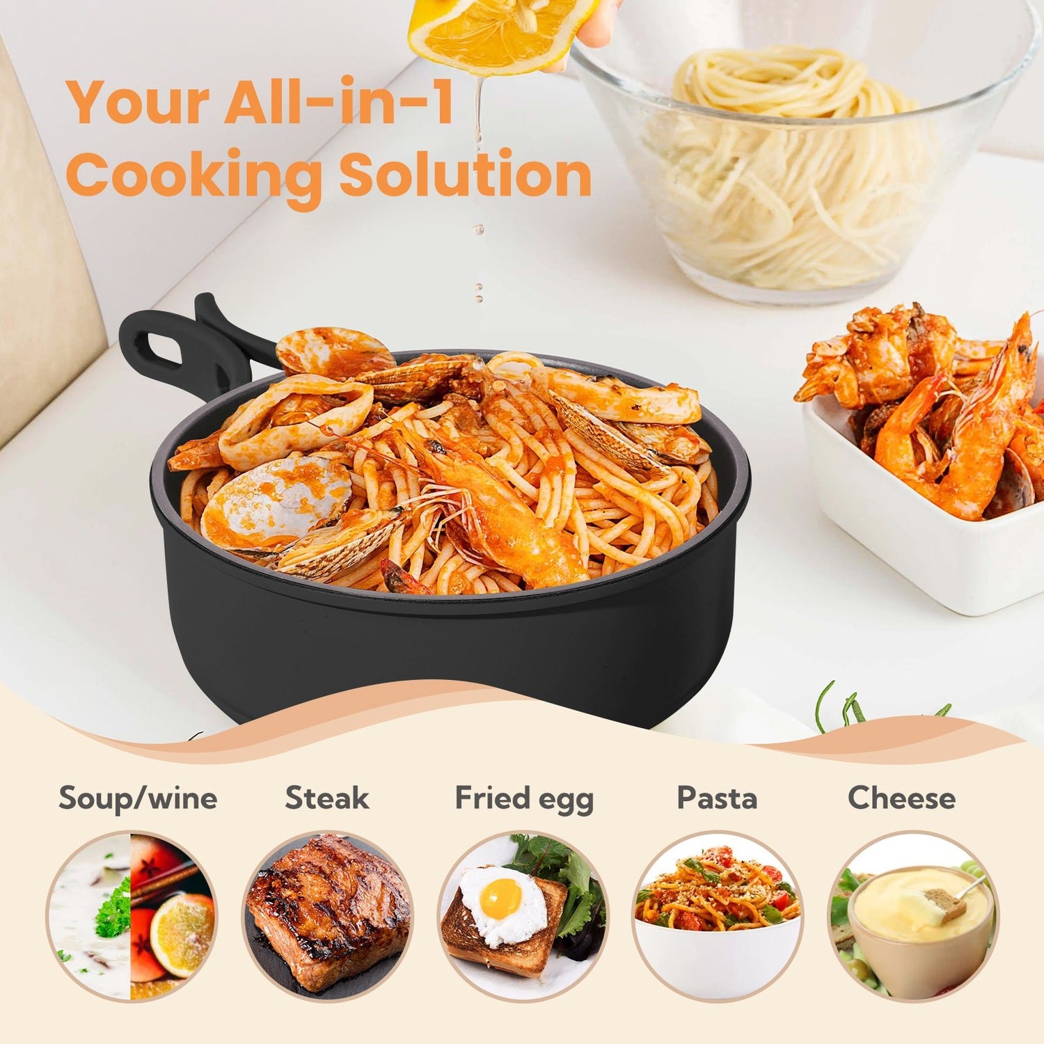 - Your all-in-1 cooking solution: The multi-function pot can be used for cooking, roasting, deep-frying, wok-frying, but also for heating and keeping food warm.